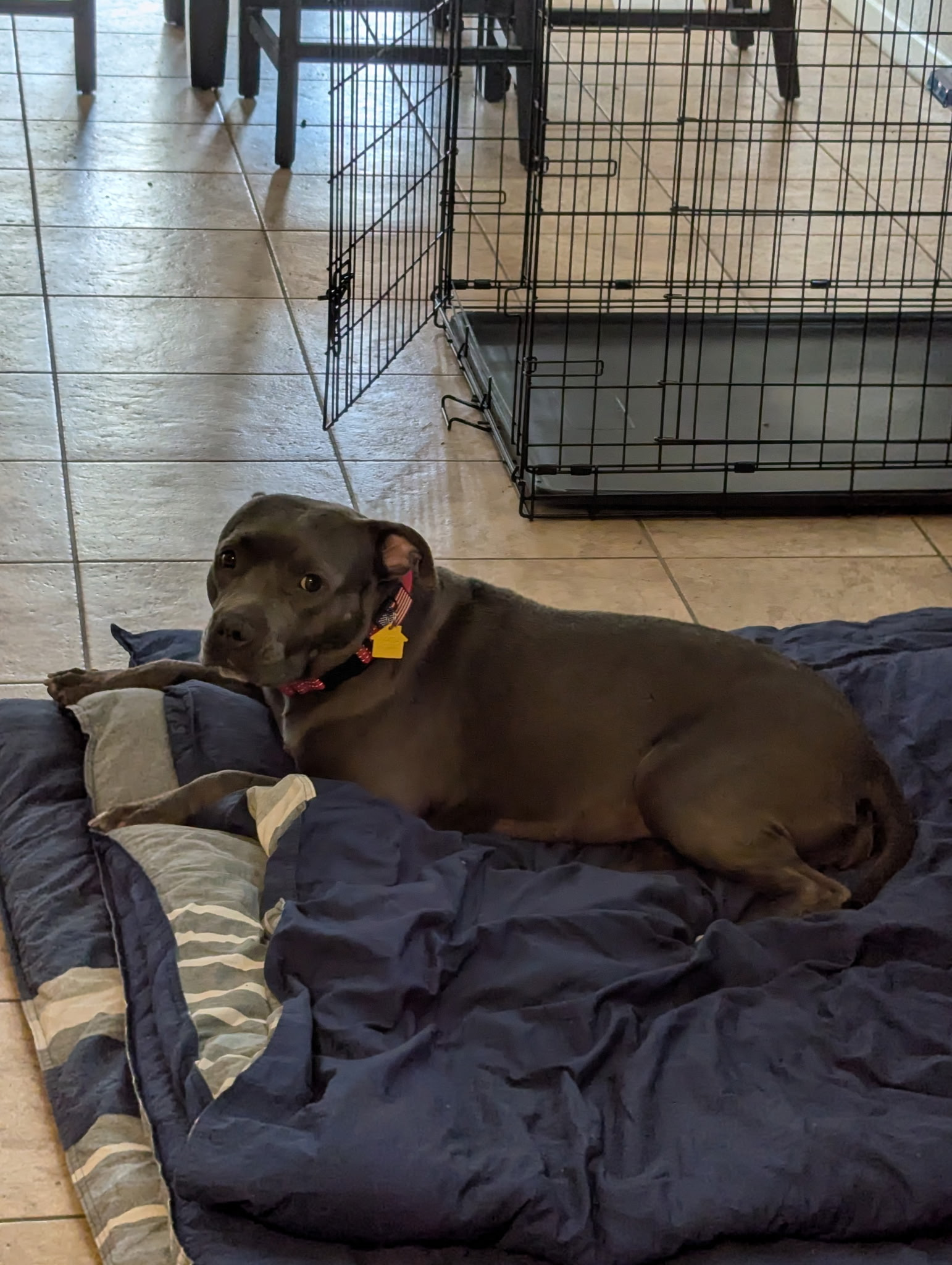 She is still very scared. Sudden noises and movements can send her running for cover. She’s hand-shy and flinches even when approached gently. Her tail wags excitedly when she’s spoken to in a soft, loving voice—but the moment a hand reaches out, her tail tucks between her legs. It’s clear she was deeply mistreated in the past, and the trauma still lingers.